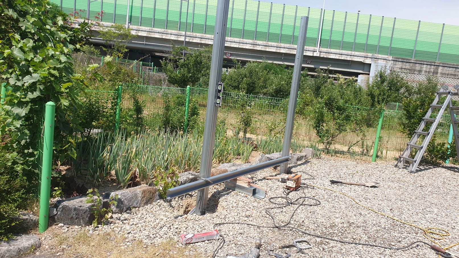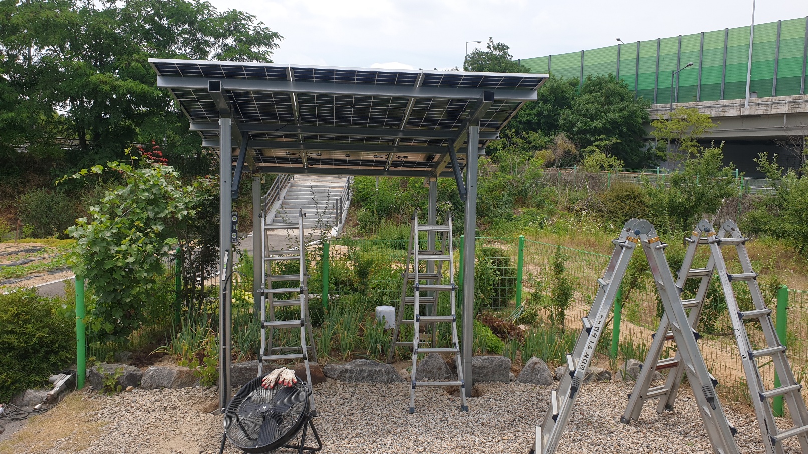 ⸻ ✅ 명품이앤지만의 태양광 시공 노하우! 우선, 태양광 모듈을 튼튼하게 설치하게 위해 주택 마당에 구조물부터 시공합니다.